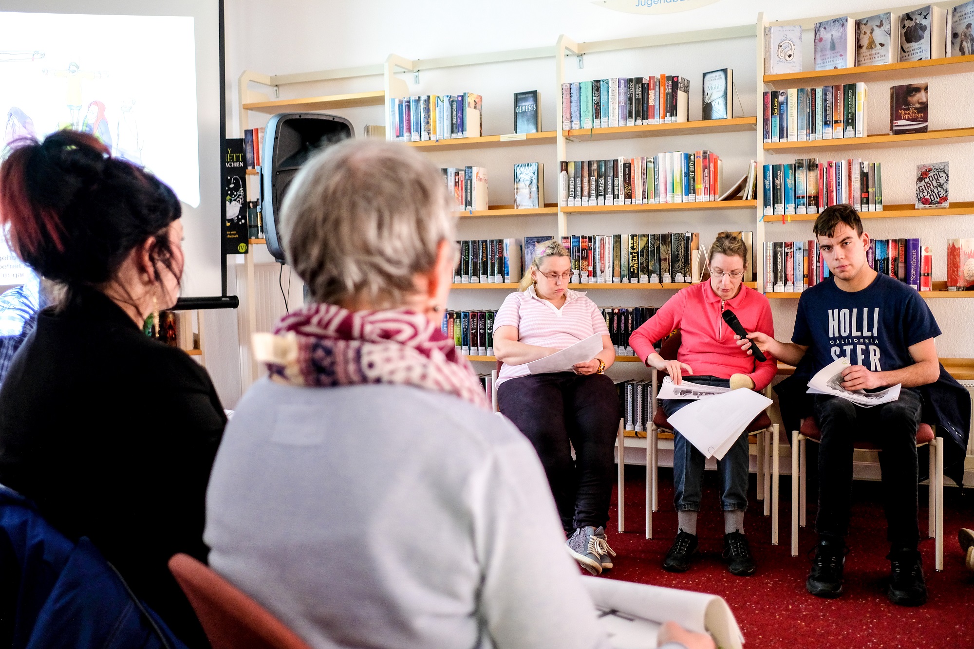 Zu dieser Lese-Kreis Veranstaltung lasen diese gemeinsam den Text vor. Michael Bach vom Büro für Leichte Sprache zeigte dazu die passenden Bilder.